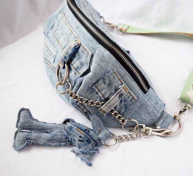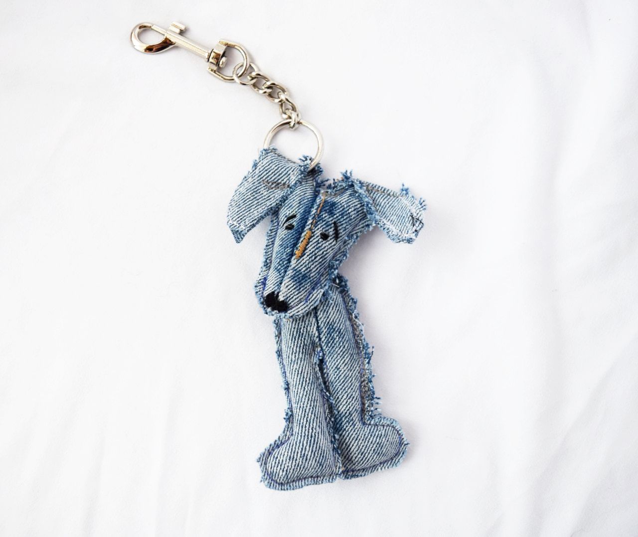 Brelok lub zawieszka wykonany ze skrawków dżinsowych.